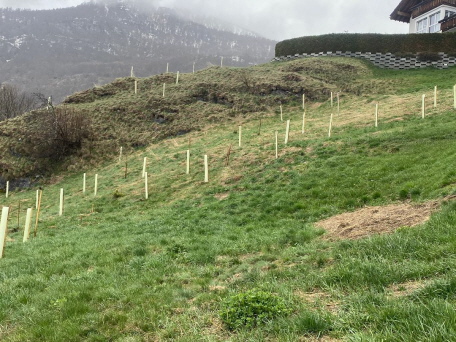 Im April 2024 wurden auf 99 100 Traubeneichen gepflanzt. Wie viele dieser mit Bissschutz versehenen Bäume die nächsten 25 Jahre überleben und eine Höhe von 5-10 m erreichen, das ist fraglich. Es ist ein Versuch, die auf dieser Höhe kränkelnden Arven zu ersetzen.